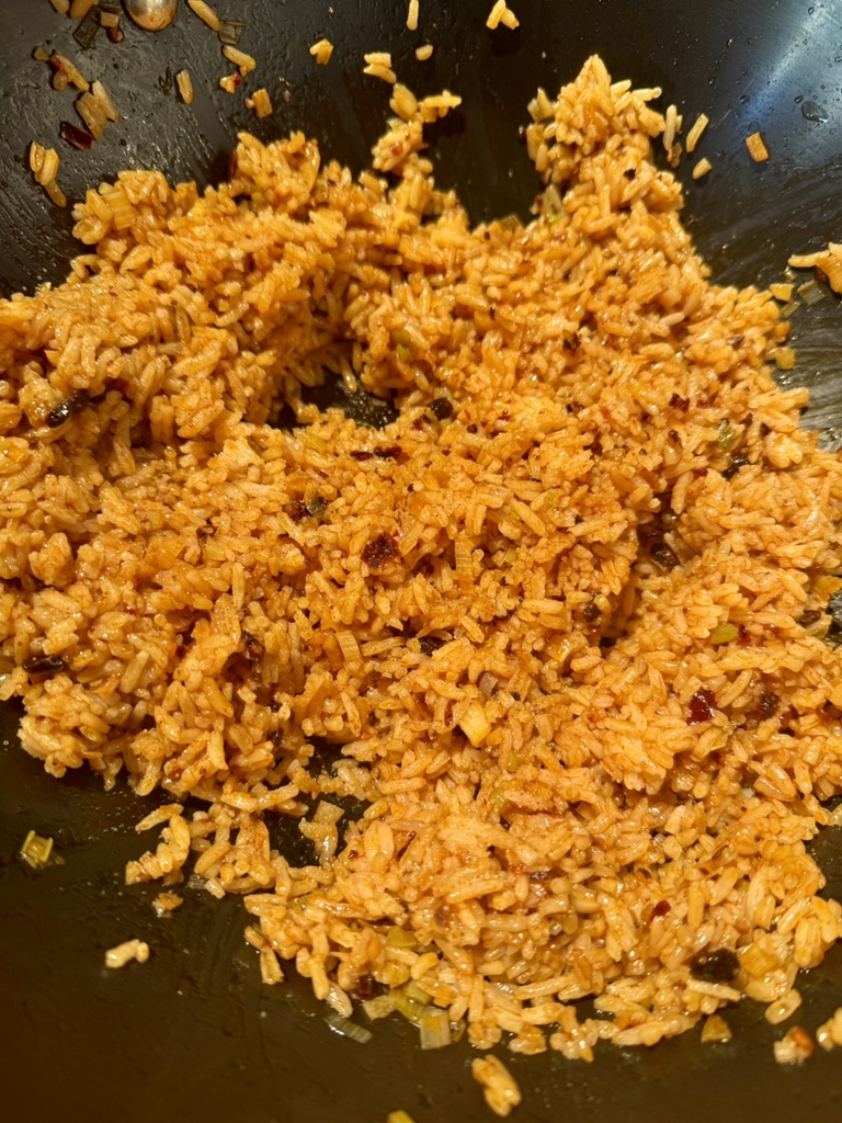 Alles wird gut verrührt und sofort folgt der gegarte Reis. Die Reiskörner werden unter ständigem Rühren voneinander getrennt, während sie den Geschmack dieser Würzmischung in sich aufnehmen.