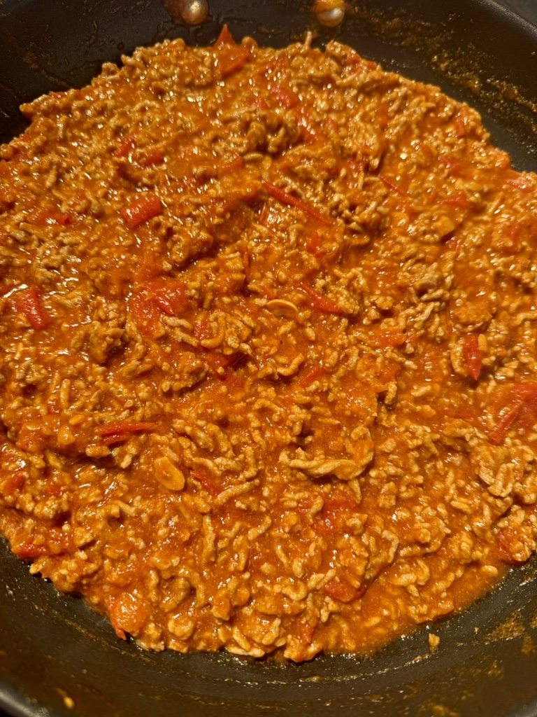 Das wird vermengt und weiter gebraten, bis die Tomaten geschmolzen sind und eine sämige Sauce entstanden ist. Weitere Gewürze sind hier nicht erforderlich.