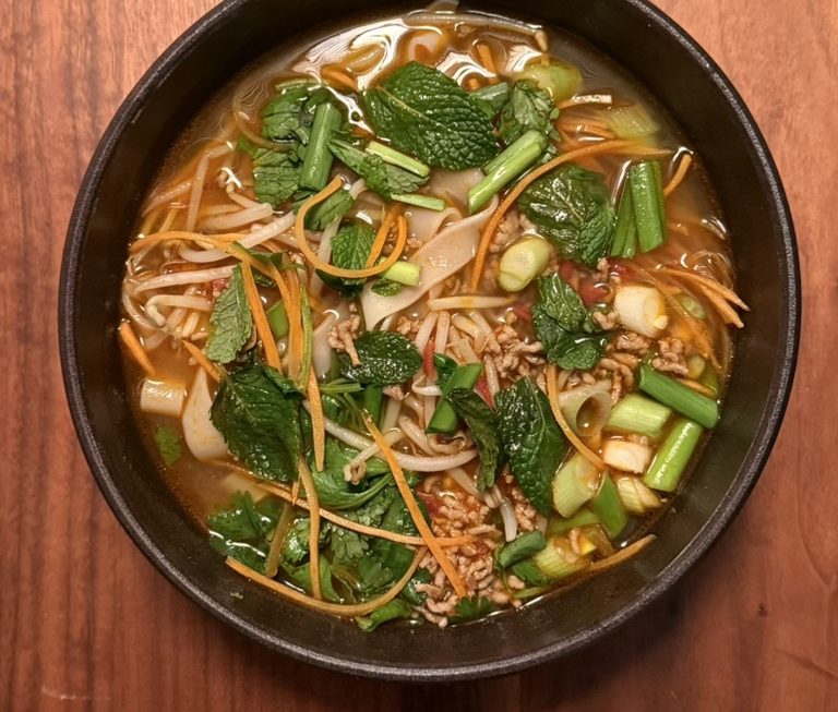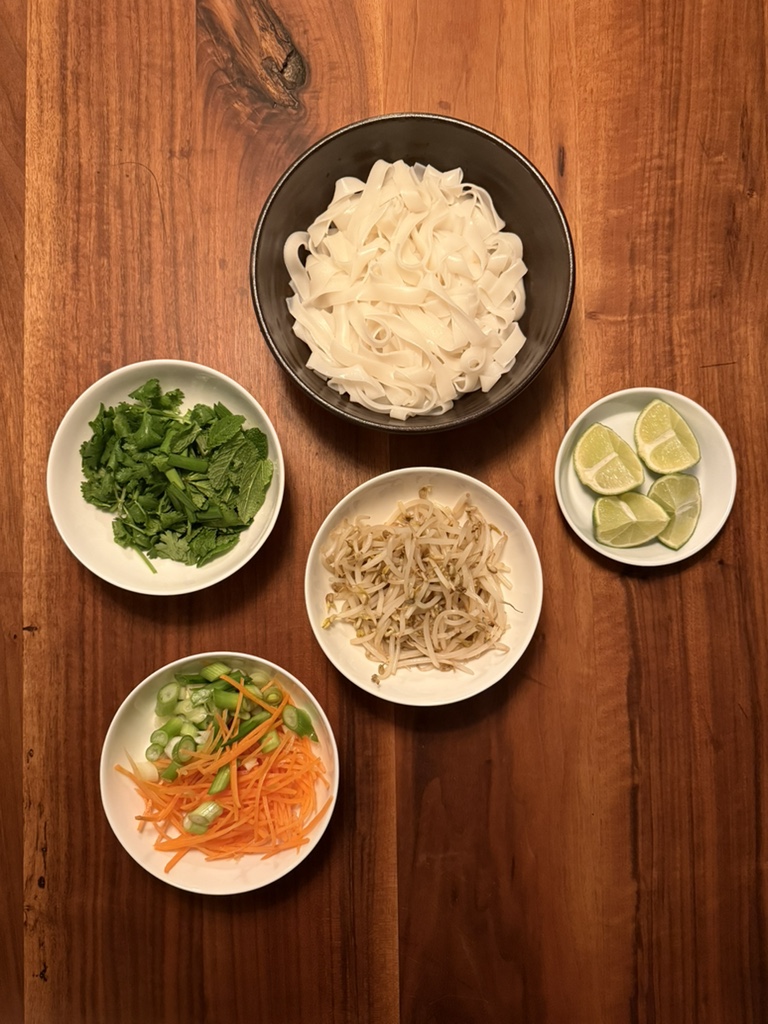 Frische Sojasprossen und Kräuter (typischerweise Koriander, Minze und Thai-Basilikum) gehören unbedingt dazu. Wir finden, dass fein geschnittene Frühlingszwiebeln und noch feiner geschnittene Streifen von der Karotte eine ganz tolle Ergänzung sind. Spritzer von Limettensaft runden das Endergebnis ab.
