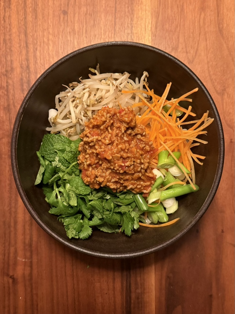 In eine vorgewärmte Schüssel werden vorgegarte (oder eben frische) Reisnudeln gelegt, dazu Sprossen, Gemüse und Kräuter nach Geschmack. Eine Portion der warmen Fleischsauce kommt obenauf.