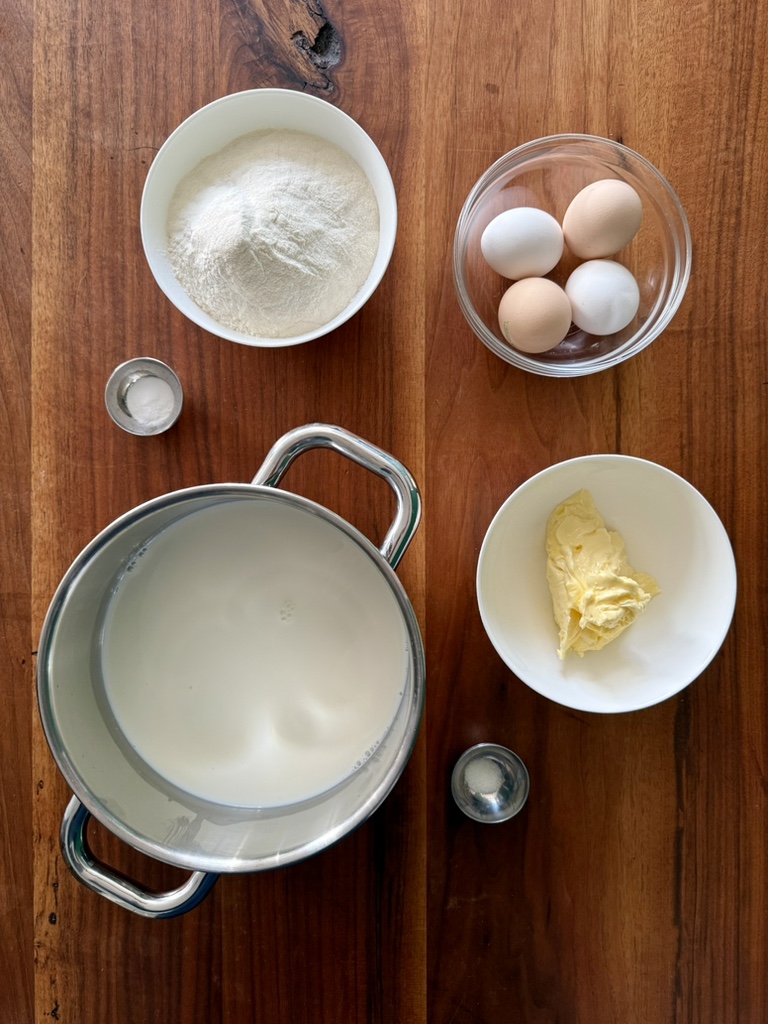 Milch (oder Milch und Wasser) wird erhitzt, aber nicht zum Kochen gebracht. Die Butter wird darin geschmolzen, bis sie ganz flüssig geworden ist. Dann reduziert man die Hitze auf kleine Stufe, gibt das gesamte Mehl auf einmal hinzu und rührt mit dem Kochlöffel sehr gründlich um, während man mit der anderen Hand den Topf festhält. Das Mehl muss sich mit der Flüssigkeit homogen verbinden und ausgekocht werden, damit es seinen rohen Geschmack verliert und quillt. Das dauert durchaus vier anstrengende Minuten. Erst wenn der Teig sich zu einer Kugel formt und nicht mehr am Topf klebt, ist dieser Schritt beendet.