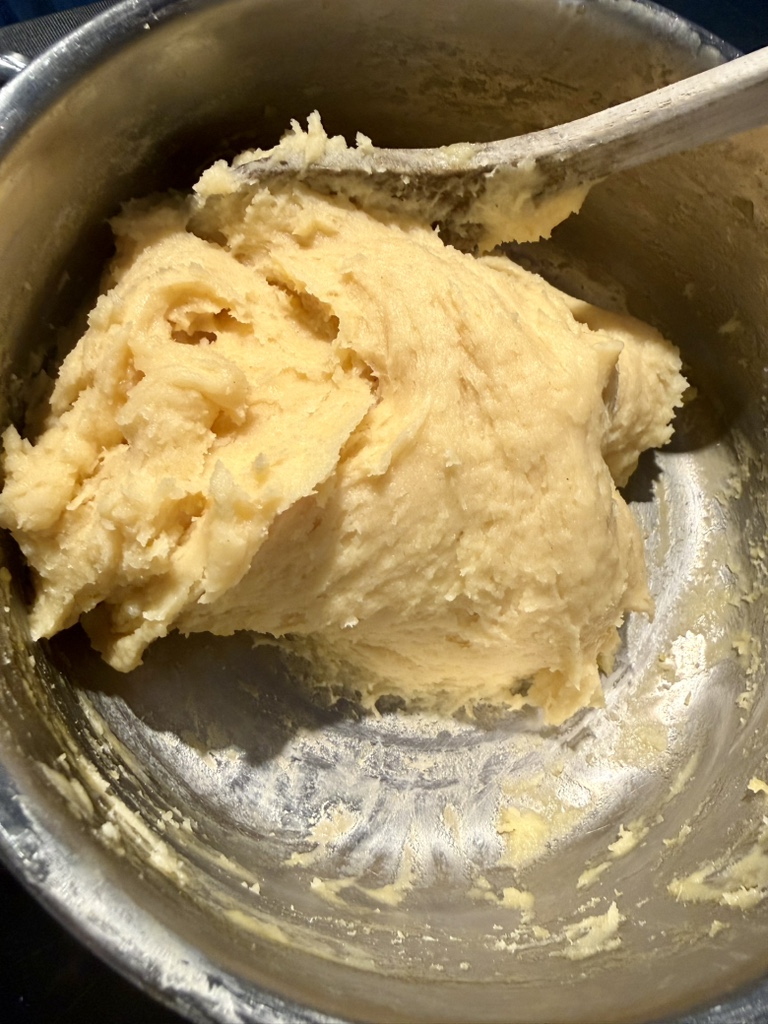 Jetzt wird der Herd ausgeschaltet, der Teig muss aber noch warm weiterverarbeitet werden. Das kann ab jetzt in einer Küchenmaschine geschehen. Mit der Hand geht es auch, ist aber noch mehr Arbeit, als man bisher schon verrichtet hat. Eier werden einzeln in eine Schüssel aufgeschlagen, damit man etwaige Schale entfernen kann. Dann wird immer ein Ei zum Teig gegeben und durch Rühren eingearbeitet. Erst wenn sich alles verbunden hat, folgt das nächste Ei. Der Vorgang ersetzt das Fitnessstudio.