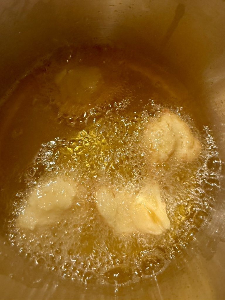 Schmalz oder Pflanzenfett oder neutrales Öl wird in einem kleinen Topf auf 160 – 170 Grad erhitzt. Man stellt sich ein Glas Wasser neben dem Herd bereit, in das man zwei kleine Löffel tauchen kann. Mit einem nassen Löffel nimmt man etwas von dem Brandteig auf und formt ihn mithilfe des anderen Löffels zu einem kleinen Ball, der in das heiße Öl gegeben und darin in ca. 4 Minuten goldbraun ausgebacken wird. In dieser Zeit wendet man die Nonnenfürzle ein oder zwei Mal, damit sie von allen Seiten gleichmäßig mit der Hitze in Kontakt kommen. Präzision ist hier aber nicht angesagt.