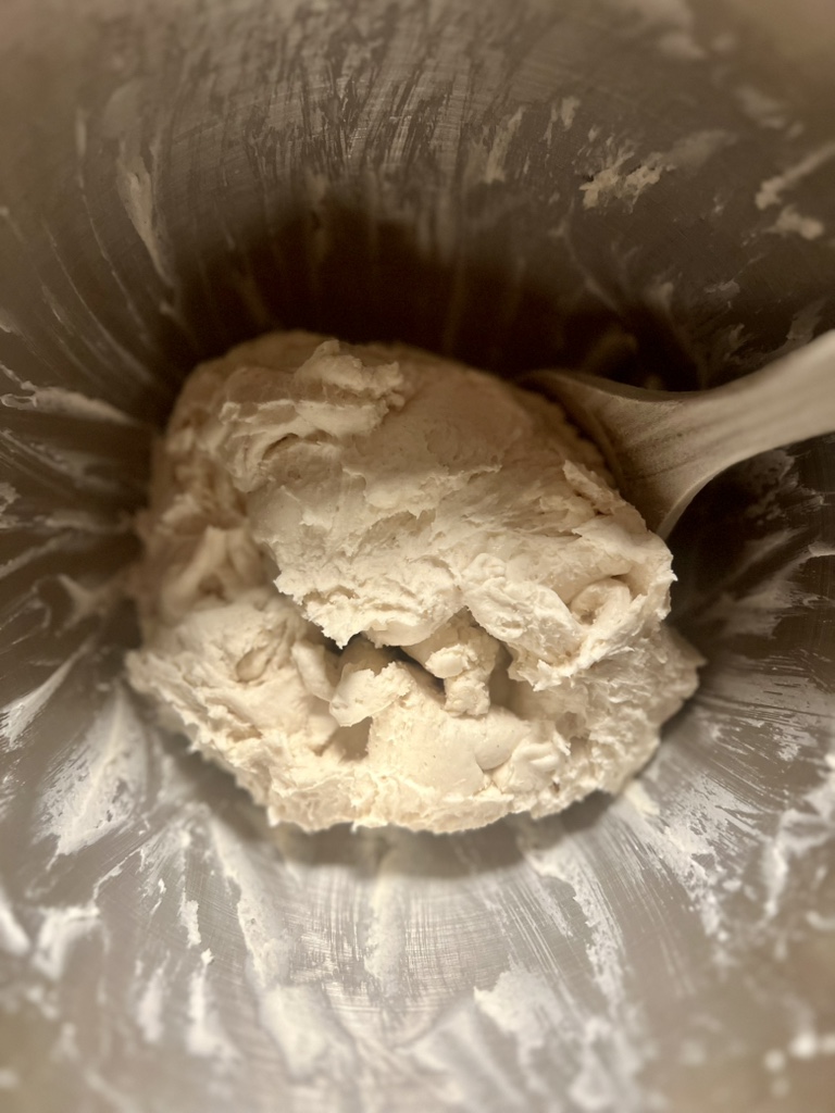 Nach dieser Zeit kann man den Teig aber relativ einfach aus der Schüssel nehmen und zu einer Kugel formen. Er ist noch sehr kompakt und die Oberfläche wird nicht glatt, sie ist aber kaum noch klebrig.