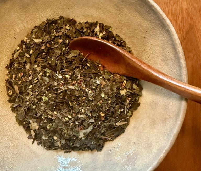 Wer Shiso anbaut, hat wahrscheinlich schon gemerkt, dass diese Pflanze sehr großzügig wächst. Und irgendwann stellt sich die Frage: Wohin mit all den Blättern? Eine wunderbare Antwort darauf ist Furikake – eine japanische Streuwürze, die traditionell Reis, inzwischen aber auch Fisch, Gemüse, Tofu und anderes verfeinert. Tipp: Einfach mal auf ein Butterbrot streuen.