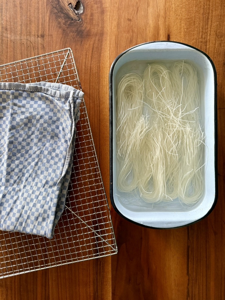 Die benötigten Reisnudeln werden häufig als Reis-Vermicelli bezeichnet und sind sehr dünn (allerdings nicht so dünn wie die Nudelform „angel hair“, von deren Verwendung wir abraten). Die Vermicelli garen blitzschnell und sind daher leicht überkocht, was sie zu einer Art Brei werden lässt. Außerdem verkleben sie rasch.