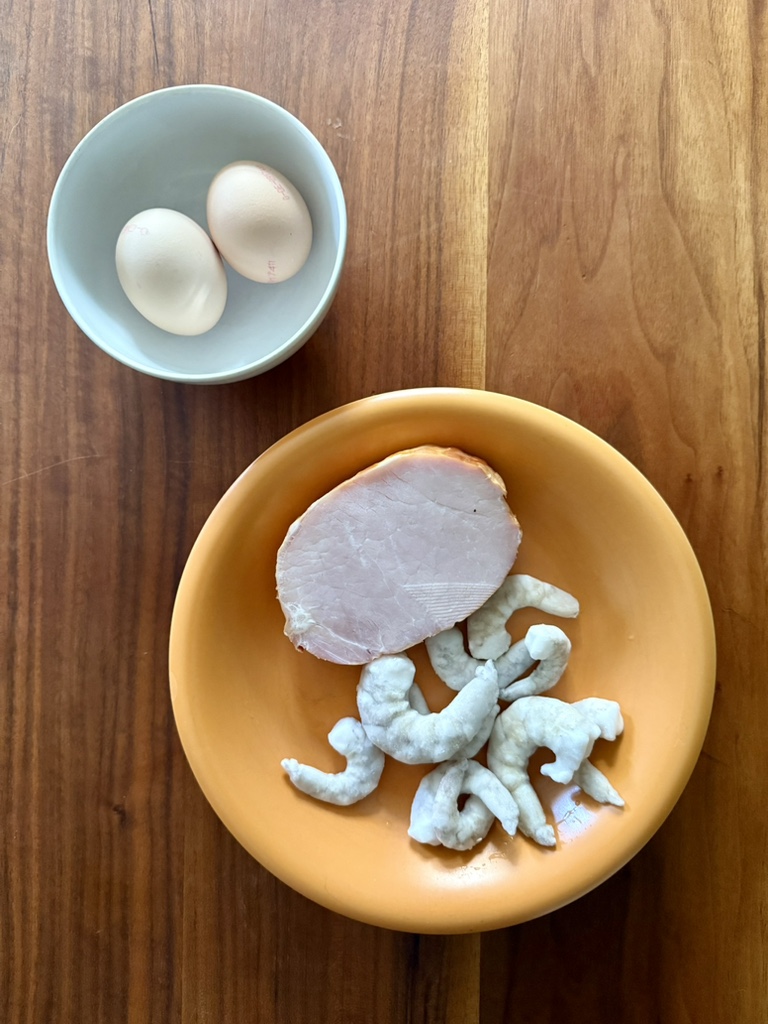 Typische Proteine in diesem Gericht sind Ei, gegartes Schweinefleisch und/oder Garnelen. Das muss aber alles nicht sein. Tofu passt wunderbar. Das Schweinefleisch ist typischer Weise Char Siu, kantonesisch gegrillter Braten. Aber auch gekochter Schinken ist verbreitet. Wir hier in Deutschland verwenden einfach Kasseler, das ist gepökeltes und leicht geräuchertes Schweinefleisch. Außerdem ein Ei pro Person und (tiefgefrorene) Garnelen.