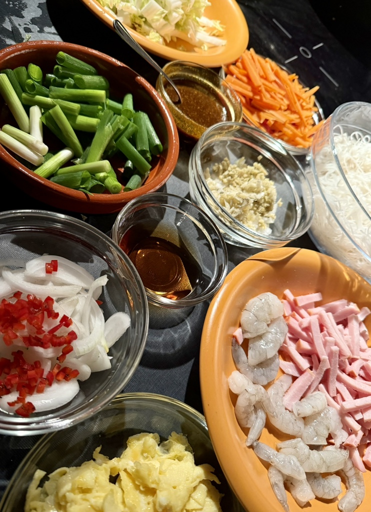 Dann folgen alle schon verarbeiteten Zutaten (Ei, Fleisch, Garnelen, Gemüse) sowie die Stücke von Frühlingszwiebeln, die nicht roh, aber besonders knackig bleiben sollen.