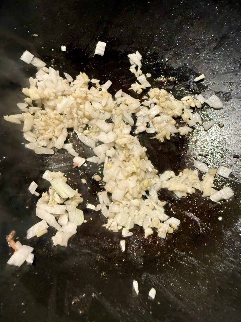 Wir stellen das beiseite und in sehr wenig weiterem Öl rührbraten wir Ingwer und Knoblauch für 30 Sekunden…
