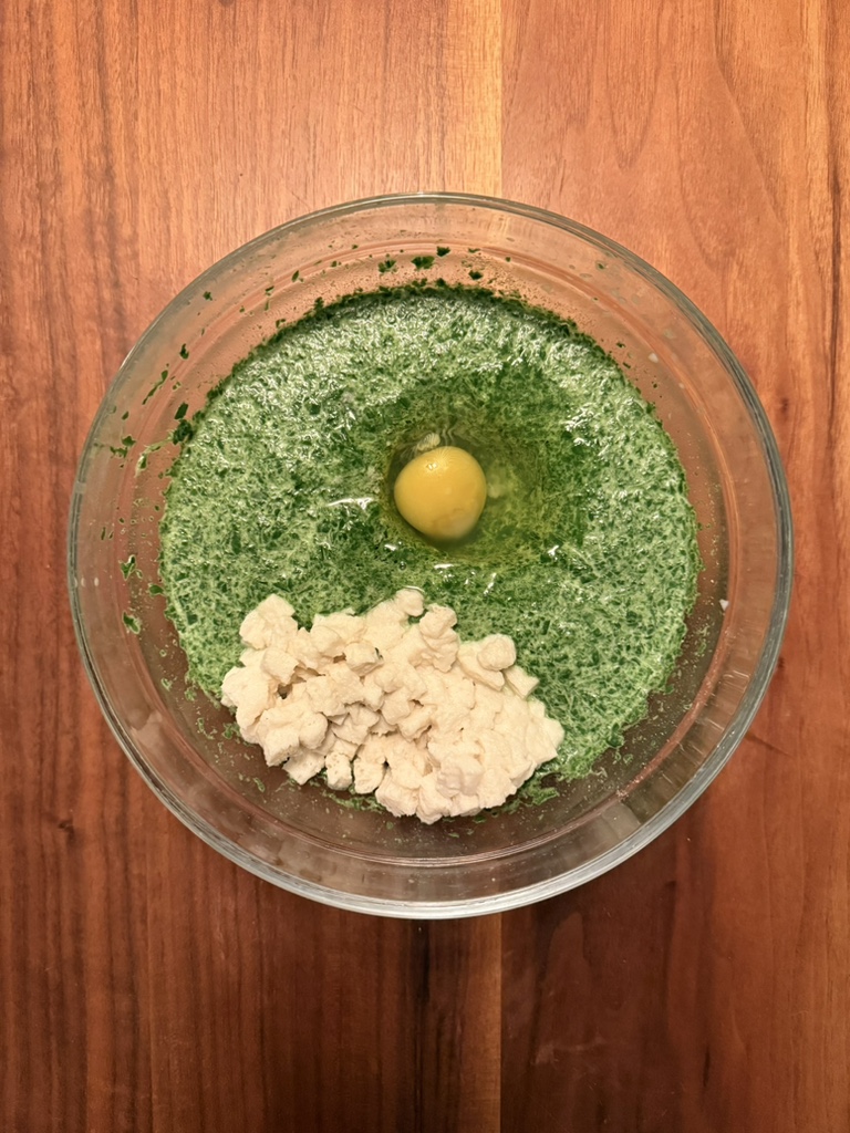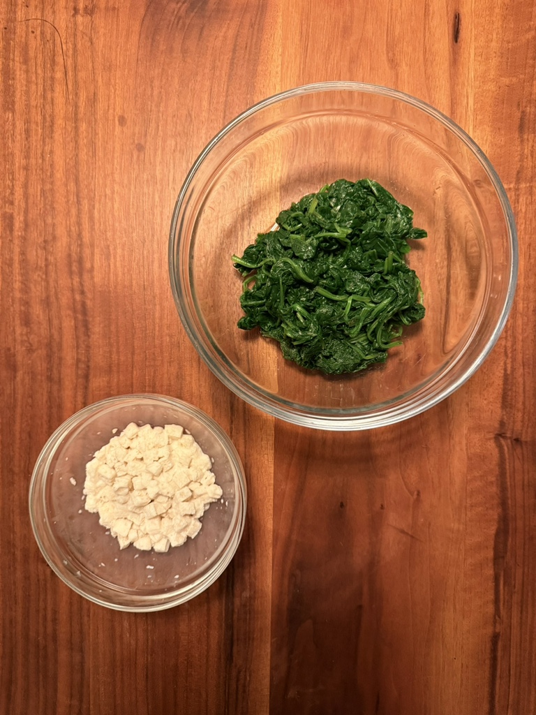 Der Spinat wird gewaschen und dann in kochendem Salzwasser blanchiert, also für nur 1 Minute gekocht, dann sofort durch ein Sieb gegossen und mit kaltem Wasser abgekühlt, um den Garprozess augenblicklich zu beenden. Danach muss das Wasser gründlich mit den Händen aus dem Spinat gedrückt werden, das ist sehr wichtig, denn sonst funktioniert alles weitere nicht.