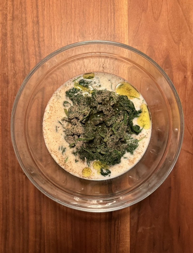 In einer großen Schüssel werden weitere Milch, der blanchierte Spinat und wenig Olivenöl mit Salz, schwarzem Pfeffer aus der Mühle und frisch geriebener Muskatnuss vermengt.