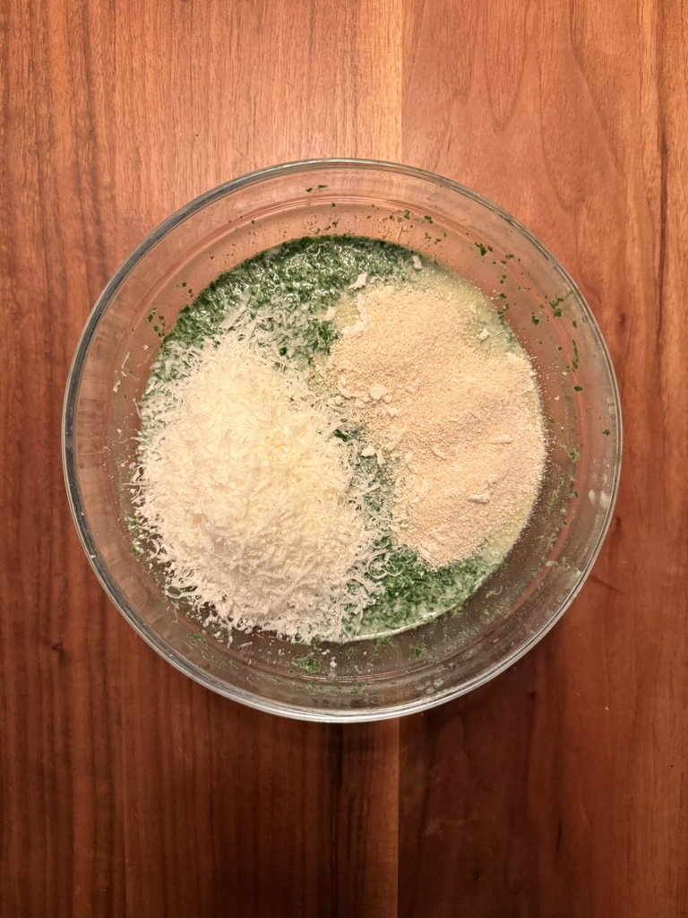 Die Mischung wird weiter angedickt mit Semmelbröseln und Trentingrana (bzw. Grana Padano), der eine Menge Umami beisteuert.